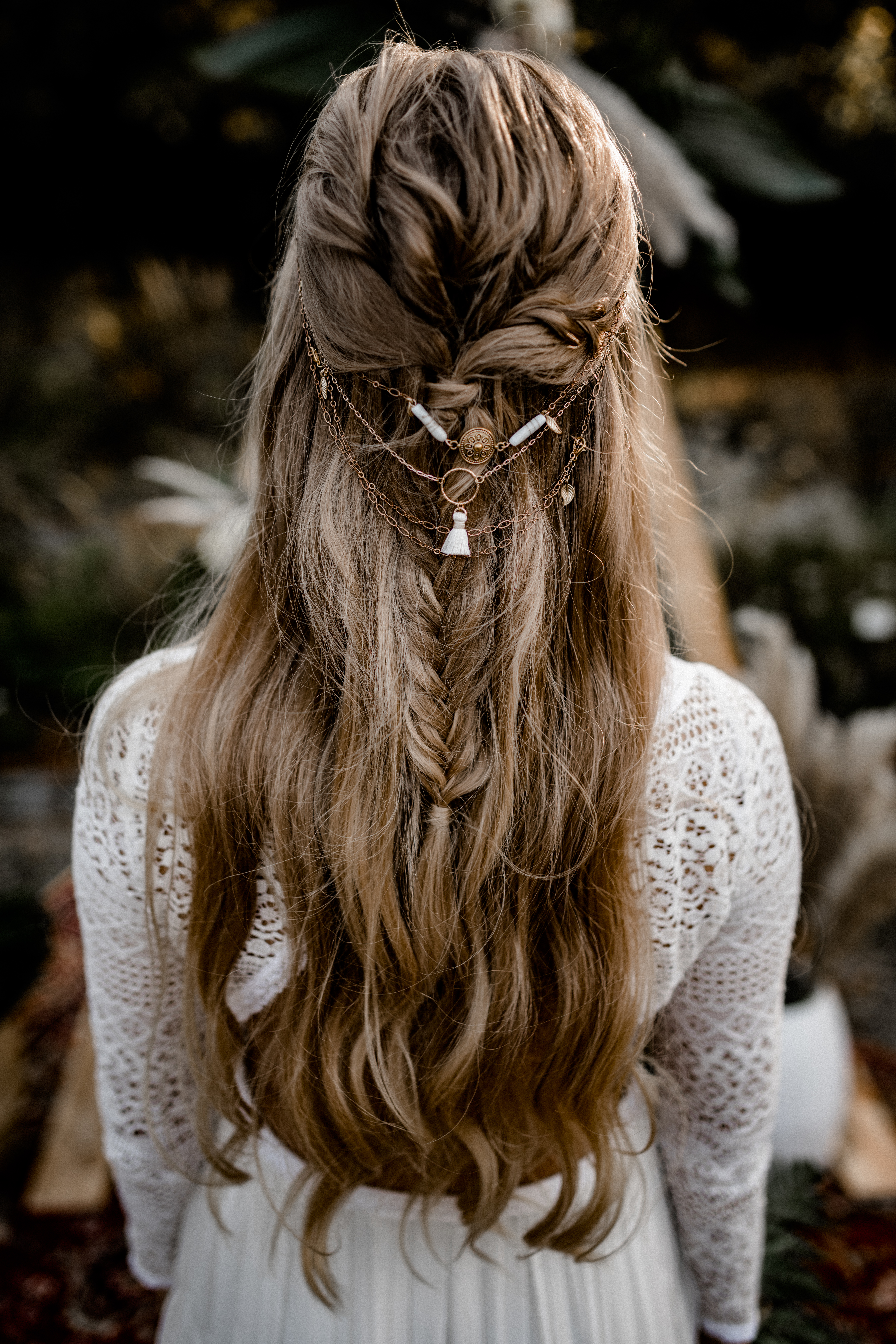 Für halboffene Frisuren, bei denen die Haare teils offen und teils gesteckt sind, eignen sich leicht fließende Schmuckelemente: